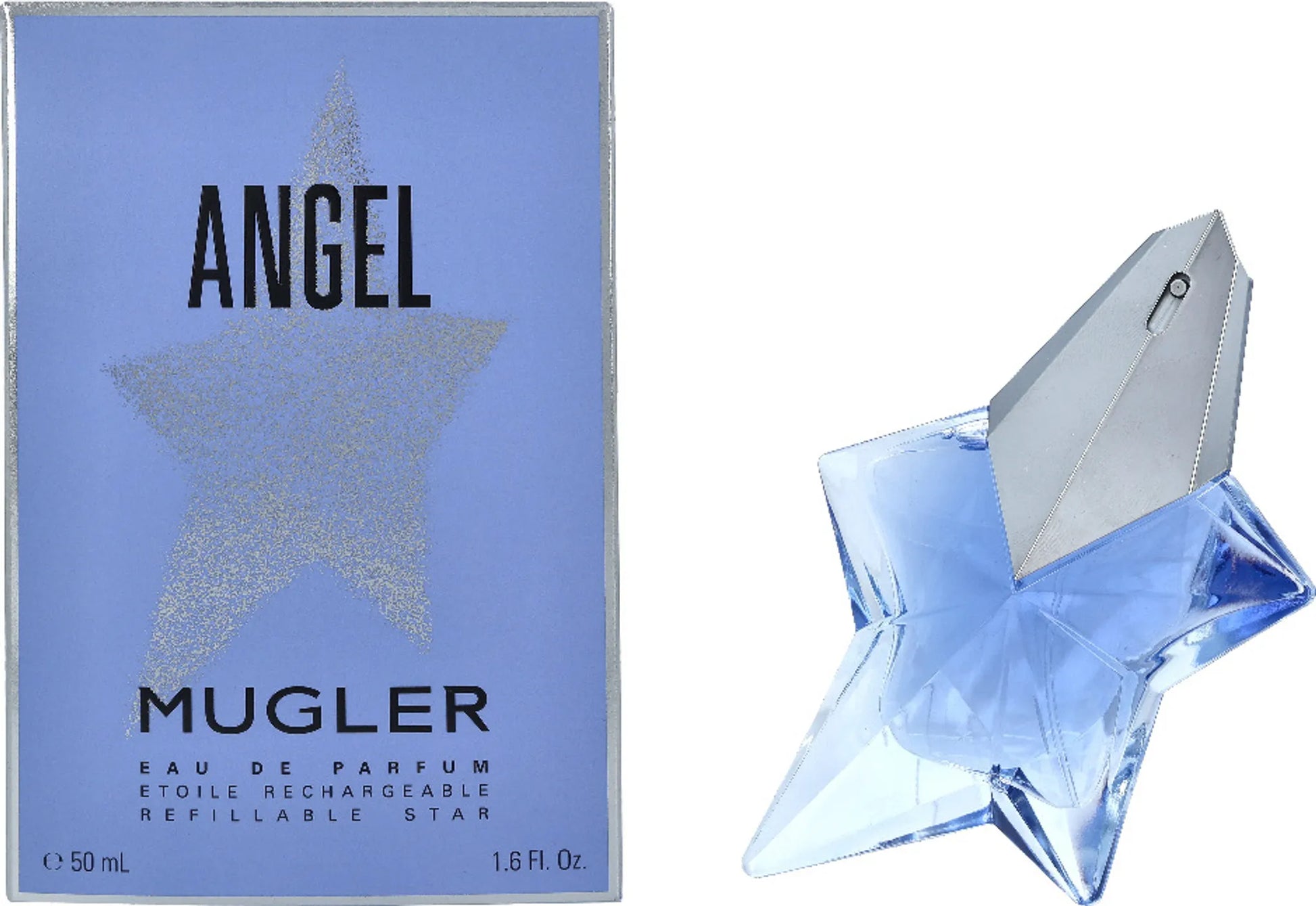 Mugler Angel Eau de Parfum 50 ml – der erste Gourmand-Duft der Geschichte (1992), eine süchtig machende Mischung aus Bergamotte, Praline, Patschuli und Vanille. Nachfüllbarer sternförmiger Flakon, eine kühne und zeitlose Kreation.